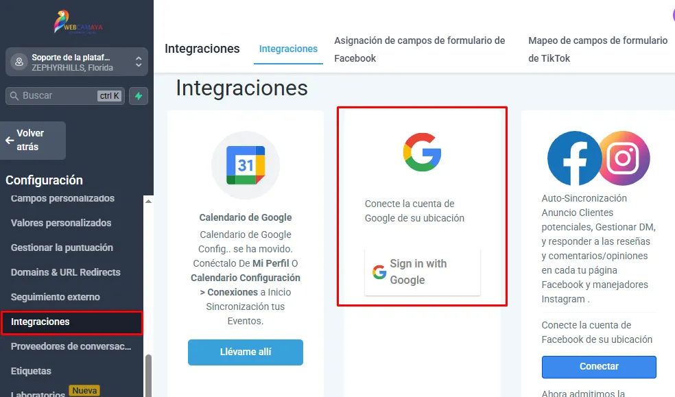 Seleccionar Google: Elija la opción de integración con Google. El sistema le pedirá que inicie sesión en la cuenta de Google que es la propietaria o administradora de su Perfil de Empresa (Google My Business).