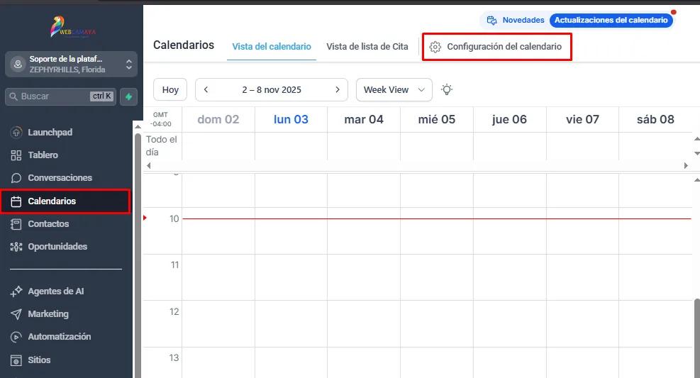 Ingresa a la subcuenta donde quieres configurar tu calendario (por ejemplo, “Agentes de Seguros”, “Soporte”, “Ventas”, etc.).
