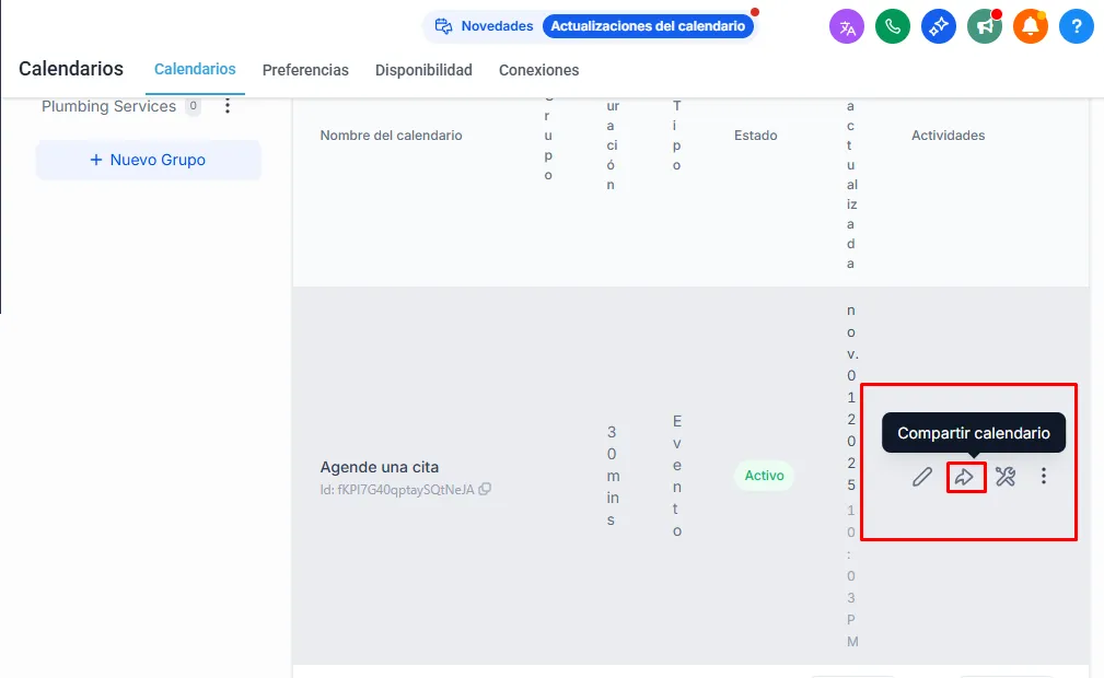 Dentro de Configuración > Calendarios, localiza el calendario que quieres incrustar.