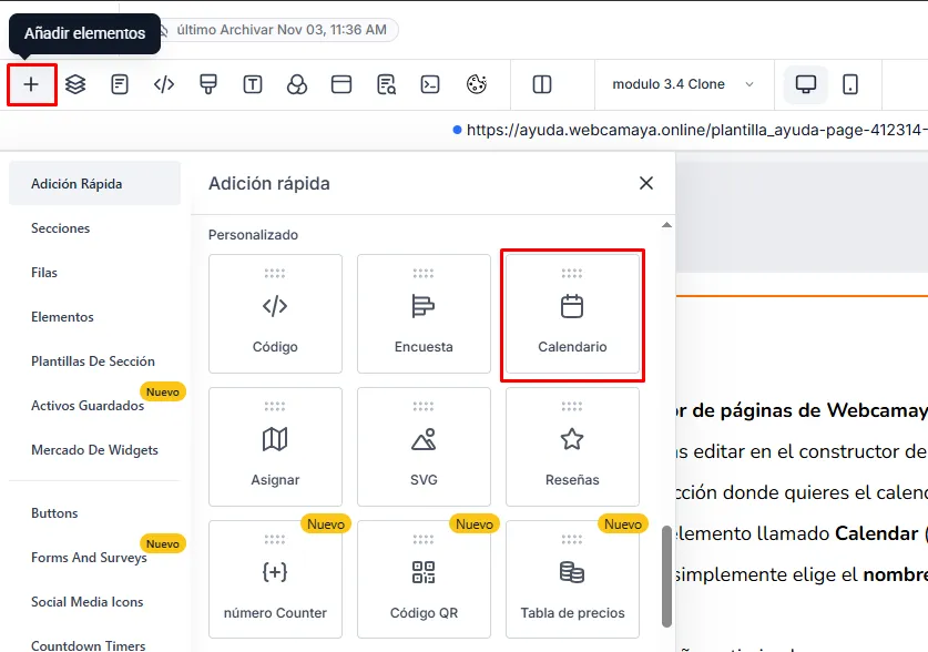 Añadir Elemento: Agrega un nuevo Elemento (Element) a la sección donde quieres el calendario.